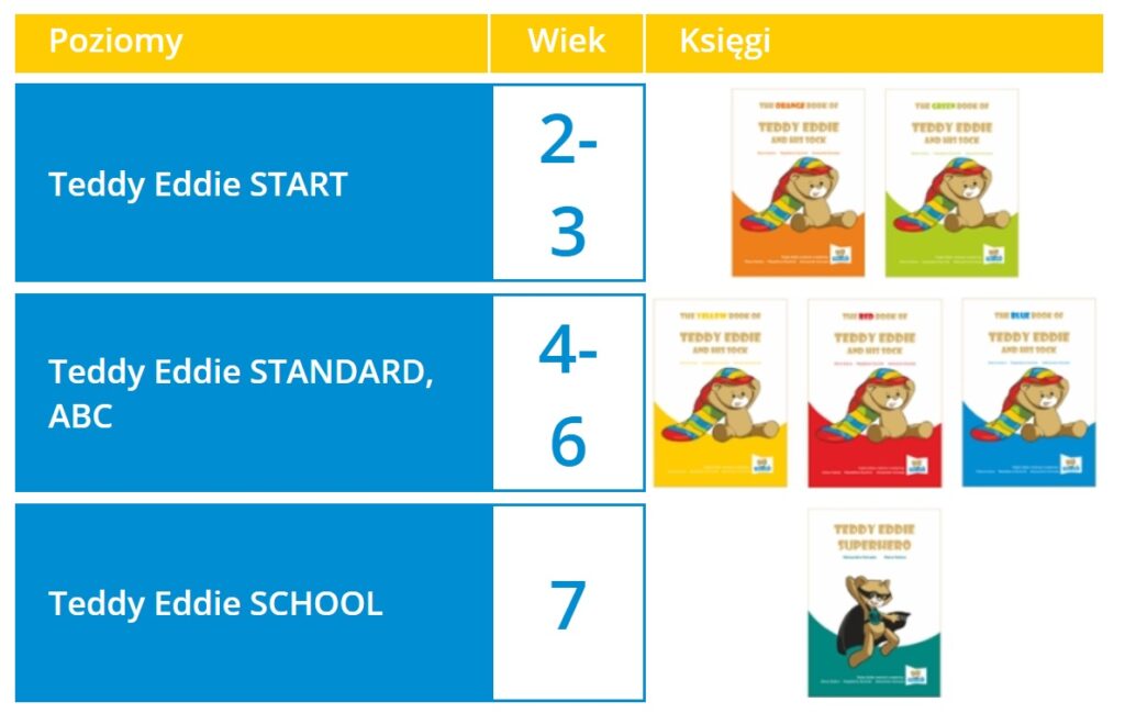 Po kursie Teddy Eddie START dziecko nauczy się reagować na angielskie polecenia i pozna swoje pierwsze zdania, piosenki i bajeczki w języku obcym.